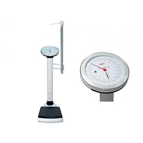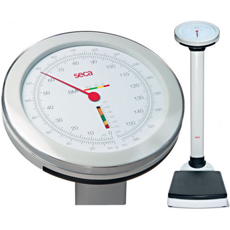 Báscula de columna mecánica con visualización y evaluación del índice de masa corporal (BMI).